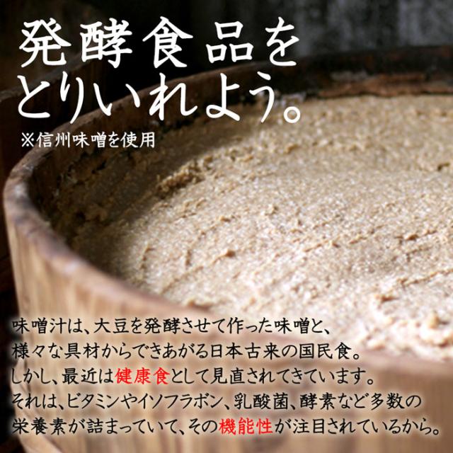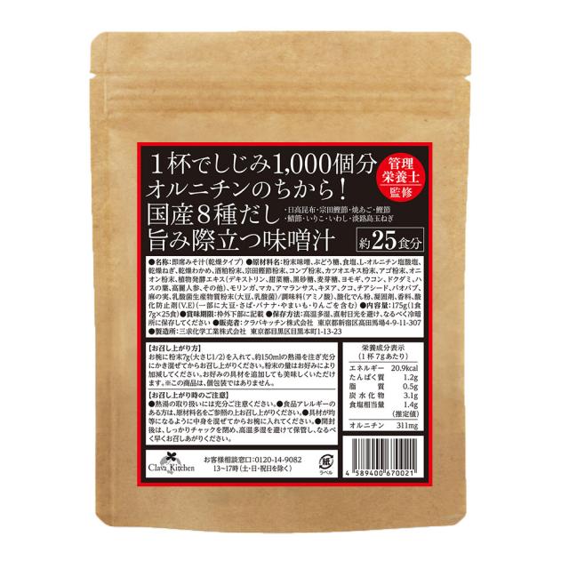 | 原材料 | 粉末味噌、ぶどう糖、食塩、L-オルニチン塩酸塩、乾燥ねぎ、乾燥わかめ、酒粕粉末、宗田鰹節粉末、コンブ粉末、カツオエキス粉末、アゴ粉末、オニオン粉末、植物発酵エキス(デキストリン、甜菜糖、黒砂糖、麦芽糖、ヨモギ、ウコン、ドクダミ、ハスの葉、高麗人参、その他) 、モリンガ、マカ、アマランサス、キヌア、クコ、チアシード、バオバブ、麻の実、乳酸菌生産物質粉末(大豆、乳酸菌) /調味料(アミノ酸)、酸化でん粉、凝固剤、香料、酸化防止剤(V.E) |