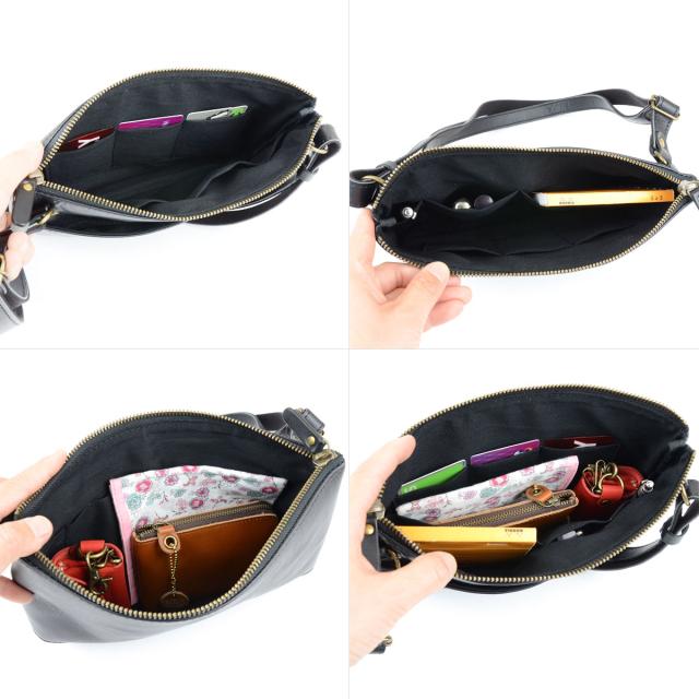 とことんシンプルなデザインだからこそ、上質な革の素材感が際立つサコッシュです。マチを斜めにつけることでふっくらしたラインの個性的な表情に。