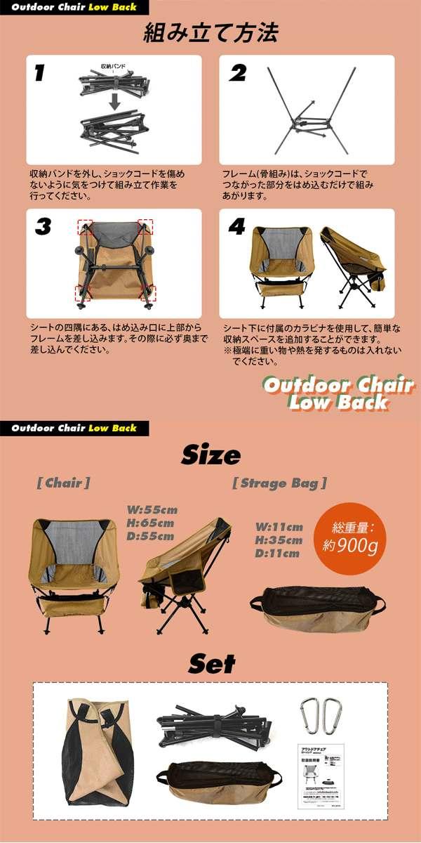 【いろいろなシーンで活躍するチェア】「キャンプ」「BBQ」「釣り」「ガーデニング」「トレッキング」「野外フェス」「運動会」「避難所」など。【コンパクトだから持ち運びに便利】本体重量(約)900gでとても軽く、お出かけ先へ手軽に持って行けます。【戦闘機等にも採用される超々ジェラルミン】フレームに使われているアルミ素材は「超々ジェラルミン」。軽くて丈夫!そして安心して座れますね。【生地は丈夫オックス900D】「ポリエステル オックス900D」は厚手のポリエステル素材の生地です。900D(デニール)は糸の太さ、オックスは生地の織り方をの事になります。オックス生地はキャンプ用のテントにも使われるほど頑丈!生地の特徴を説明すると、「厚手で丈夫」「耐摩擦・耐候性が高い」「撥水性が高い」「透湿性が低い」簡単に言うと「撥水性があるのに通気性も良い、丈夫な生地」と野外で使うアウトドアチェアピッタリの生地です。【安心して座れる耐荷重120kg】「丈夫なフレーム素材」「丈夫なシート生地」「耐久性に優れた骨組」など丈夫さにこだわりました。【「収納」も用意して使いやすさをプラス】カラビナを2個付属しているので、収納袋にカラビナを付けて座面下に設置すれば小物入れになります。また左手側のシート側面にサイドポケットを1つご用意!スマホなどの小物を出し入れも簡単です。