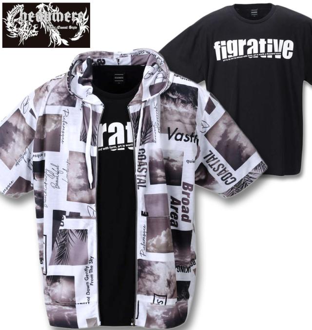 大きいサイズ BEAUMERE 昇華総柄半袖フルジップパーカー+半袖Tシャツ グレー系×ブラック 3L 4L 5L 6L/1258-2272-2-69