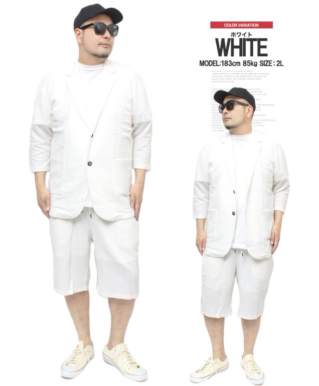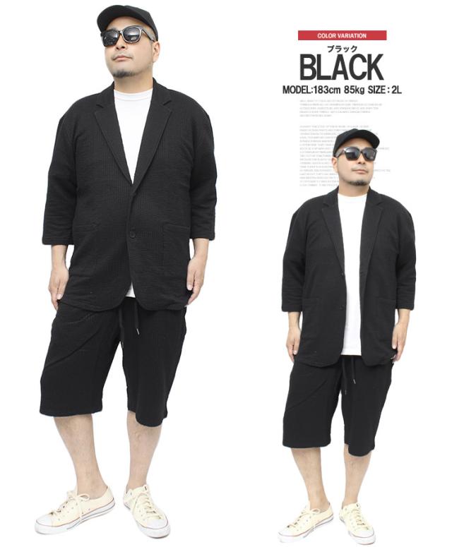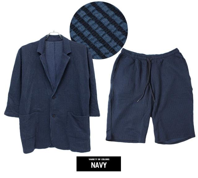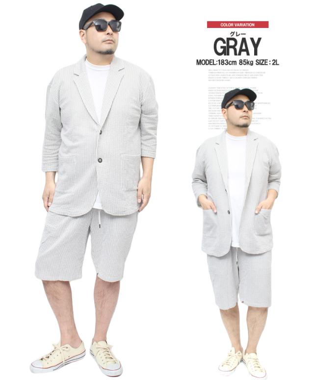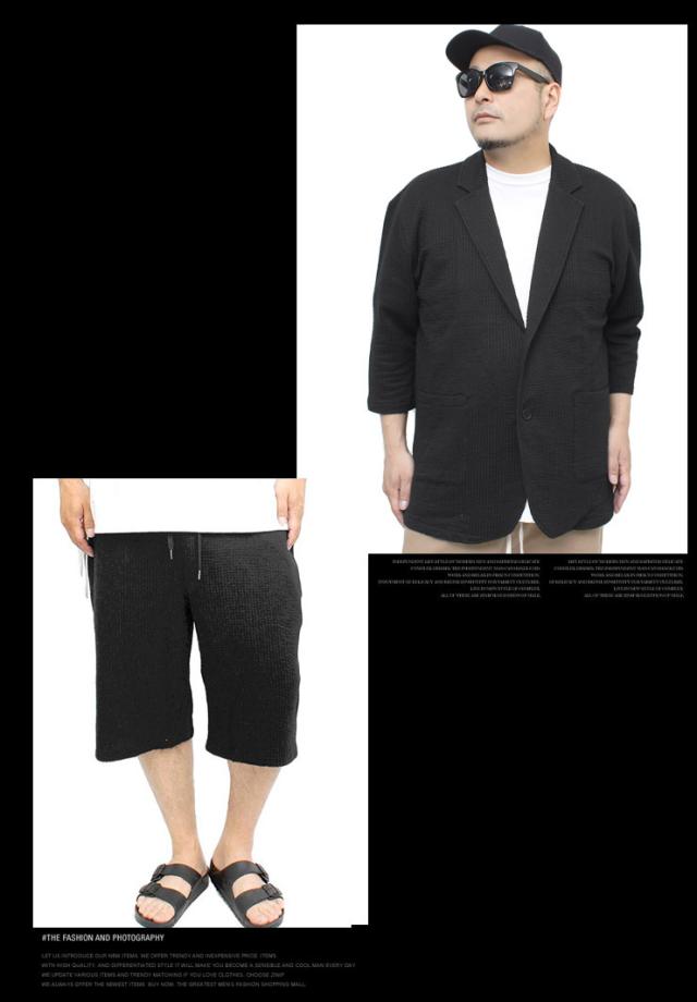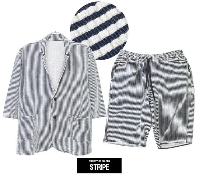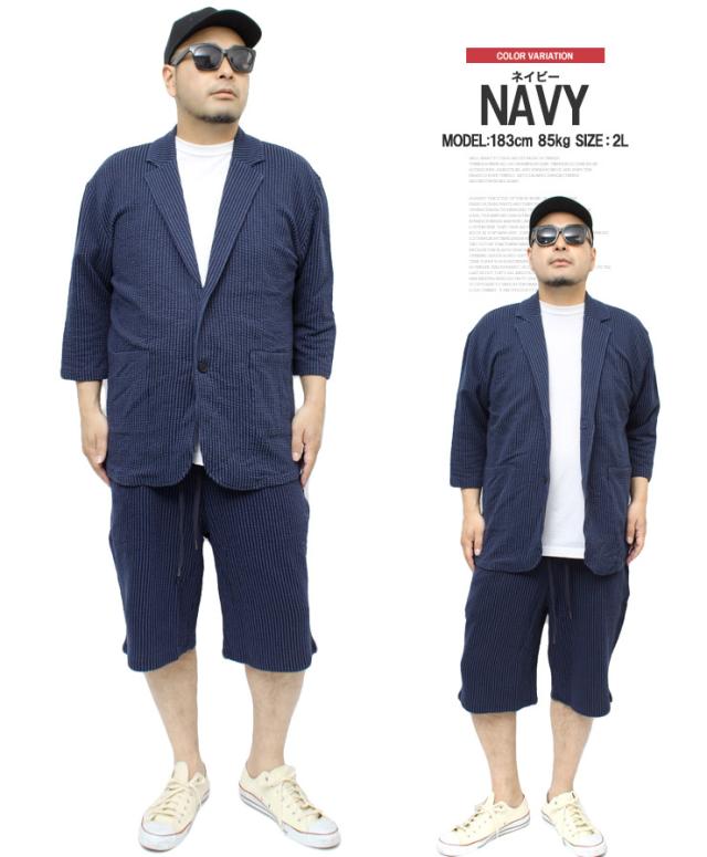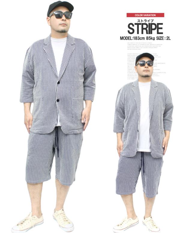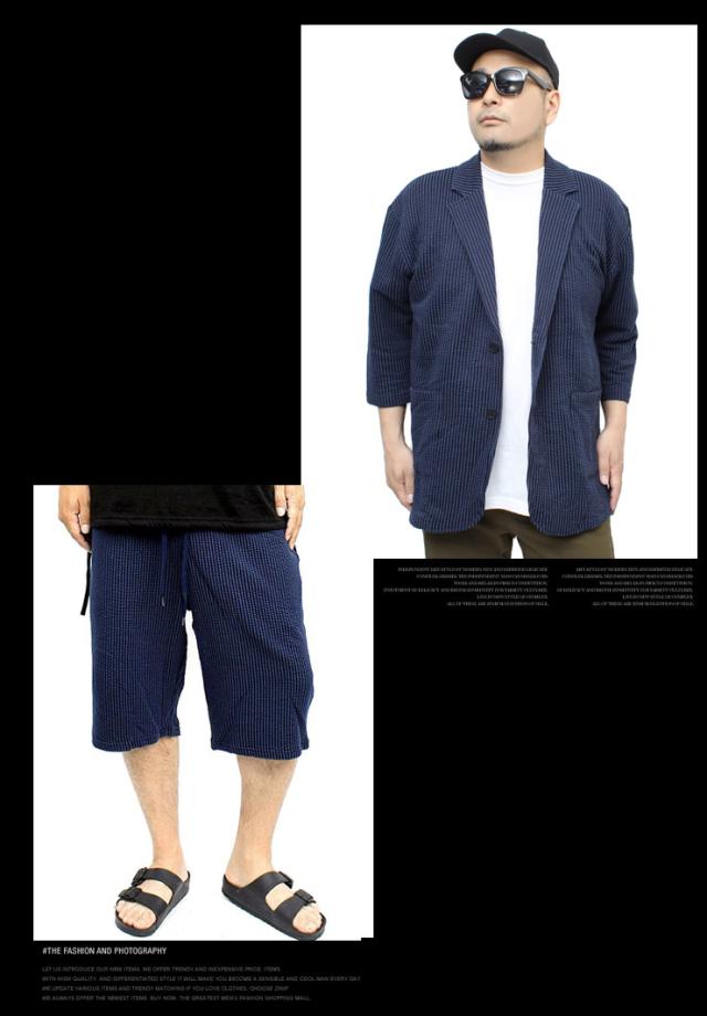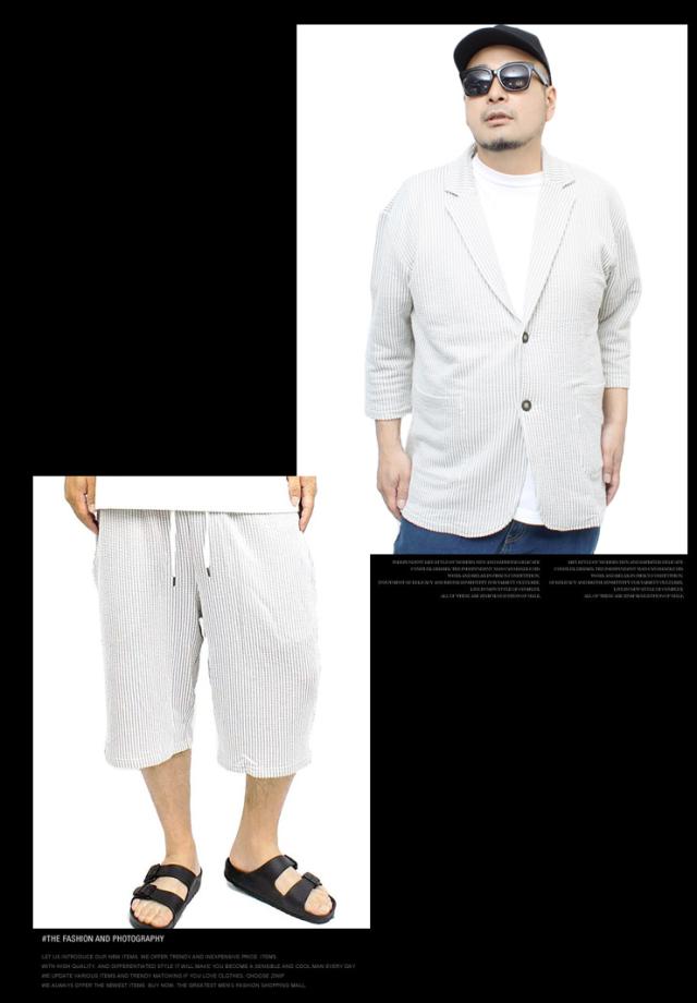【送料無料】 セットアップ メンズ 大きいサイズ シアサッカー 無地 ストライプ 七分袖 テーラードジャケット ショートパンツ ジャケット ビジネス 伸縮 7分袖 7分丈 ハーフパンツ 短パン ルームウェア 部屋着 ジャージ ワークマン プラス