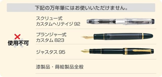 ・漆製品(蒔絵品を含む)、吸入専用万年筆、ジャスタス95にはご使用いただけません。