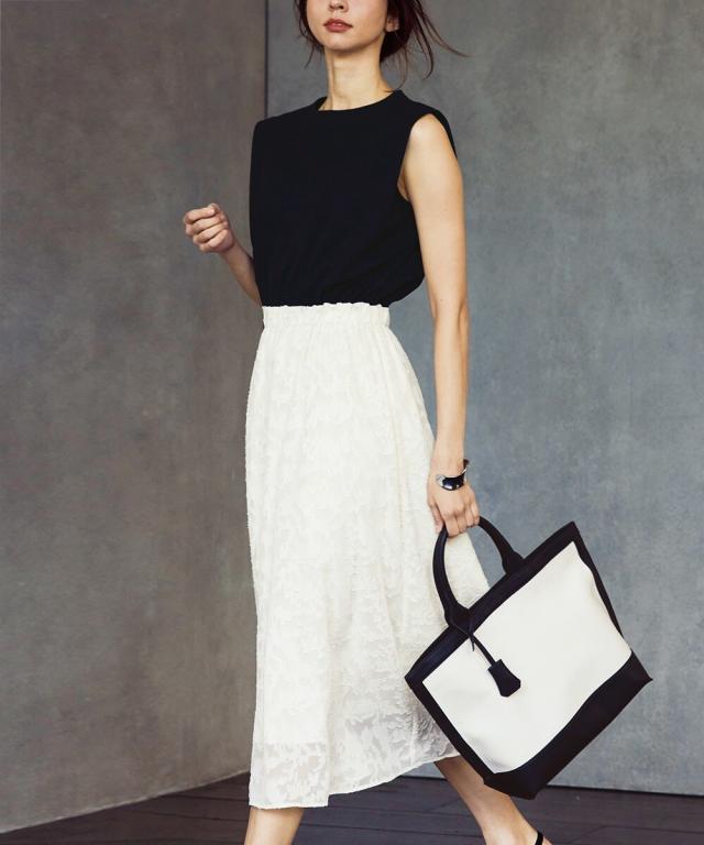伸縮性のあるリブカットソートップスとジャカード生地のスカートをドッキングしたきれいめワンピース。