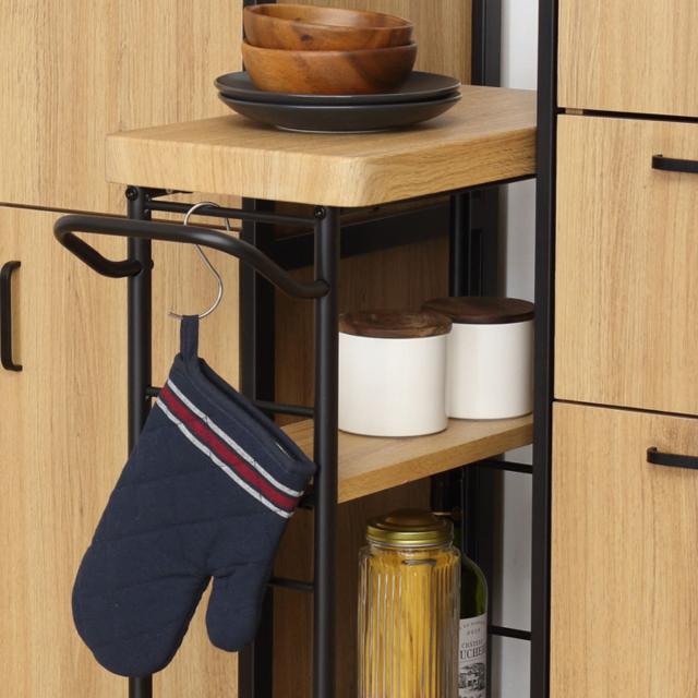 ナチュラルテイストの馴染みやすい色合いです。リビングやダイニングで場所をとらないスリムなサイズなので、すきま収納としてもお使いいただけます。
