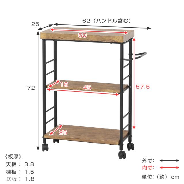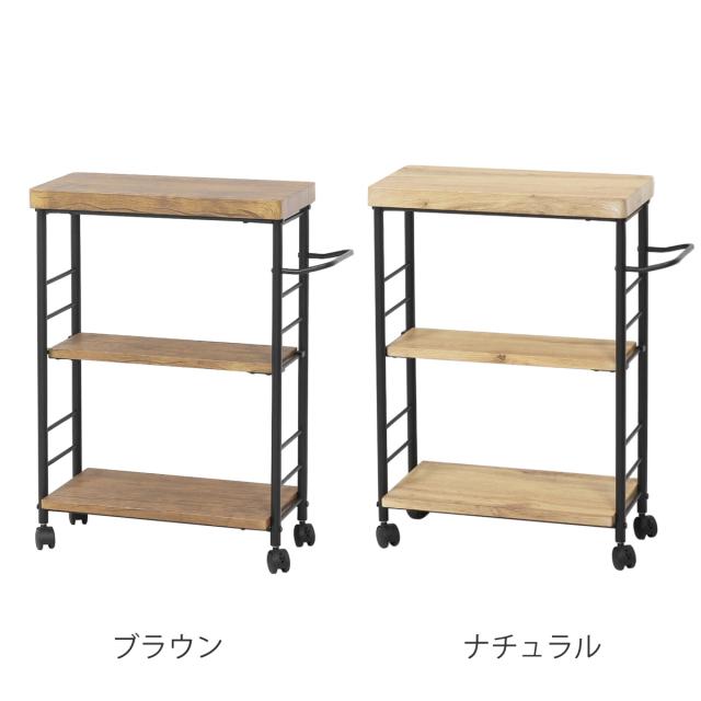 キッチンワゴン 3段 ヴィンテージ調 幅62cm ( 天板付き キャスター付き スリム 隙間収納 キッチンラック キッチン収納 作業台 補助テーブル ブラウン ナチュラル シンプル 北欧風 おしゃれ )