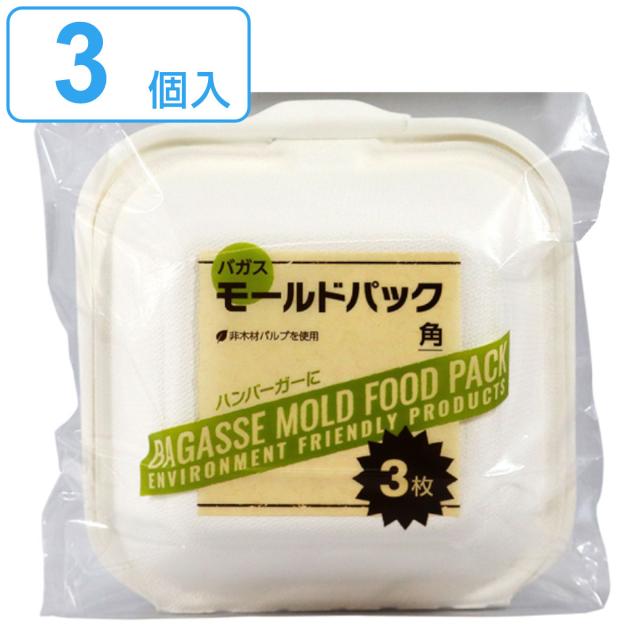 使い捨て容器 フードパック 3個入 14.5×14.3×7.8cm Green Select バガスモールドパック角 ( 使い捨て 容器 ハンバーガー 角型 パック 電子レンジ対応 テイクアウト 持ち帰り バーガー用 )