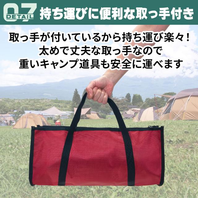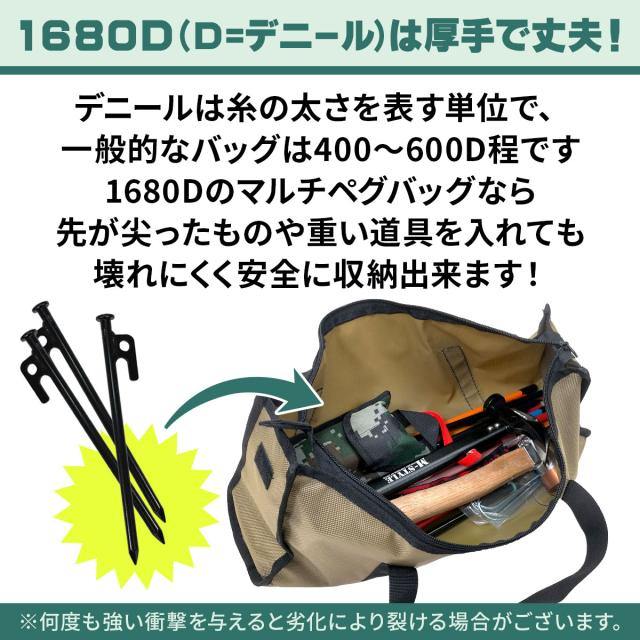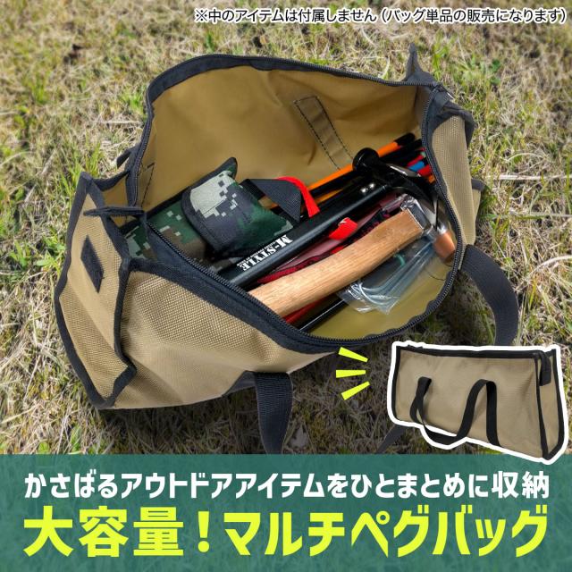 かさばるアウトドアアイテムをひとまとめに収納できる!使いやすい大容量のマルチペグバッグです。厚くて丈夫な生地なので重たいキャンプ道具を入れても安全に運べます。