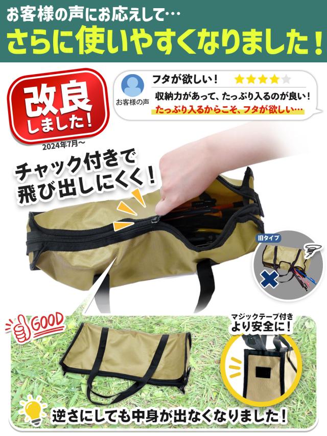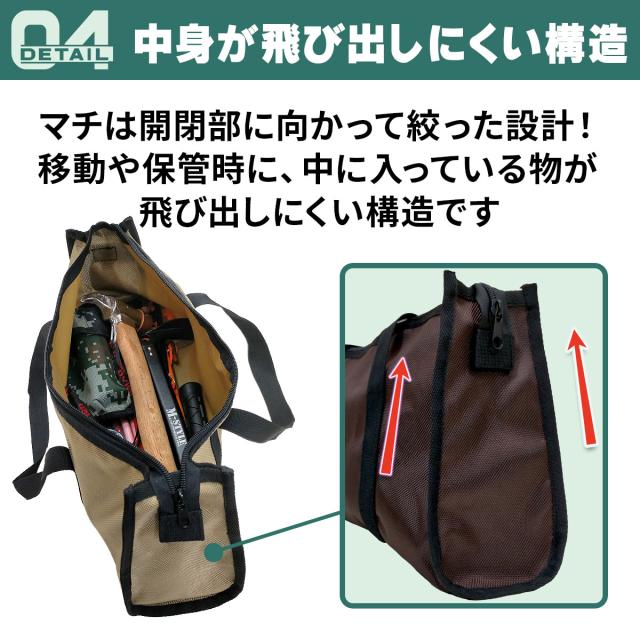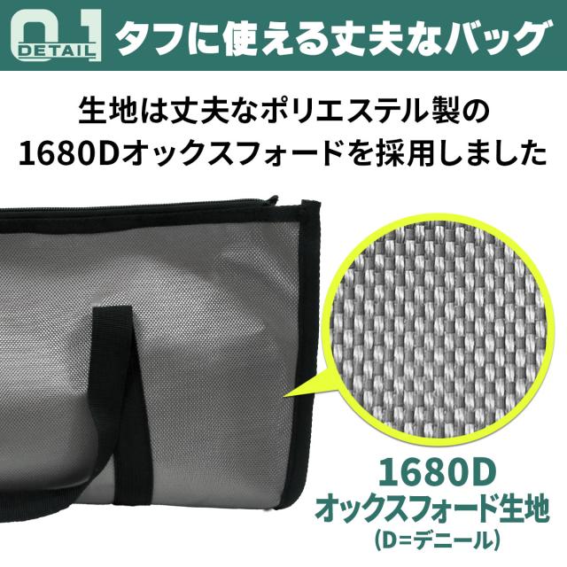 【タフに使える丈夫な生地】丈夫なポリエステル製のオックス生地を採用しました。一般的なバッグよりも頑丈で、先が尖った物や重い道具を入れても壊れにくく安全に収納できます。さらに2024年に改良を行い、中身が飛び出しにくくなりました。