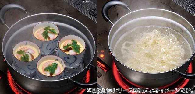 野菜の下茹でや汁物に便利な片手鍋と、たっぷりのお湯で茹でる麺料理に便利な両手鍋のセットなので幅広いお料理にお使いいただけます。目皿を使えば、茶碗蒸しや蒸しパンなどの蒸し調理が楽しめます。