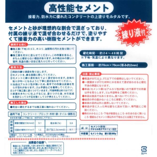 | セメントと砂が理想的な割合で混ざっており、付属の練り液で混ぜ合わせるだけで、塗りやすくて接着力の高い樹脂セメントができます。 用途・使用場所:ベランダ、土間、U字溝、ブロックの化粧仕上等 ※パッケージが変わる場合があります。 |