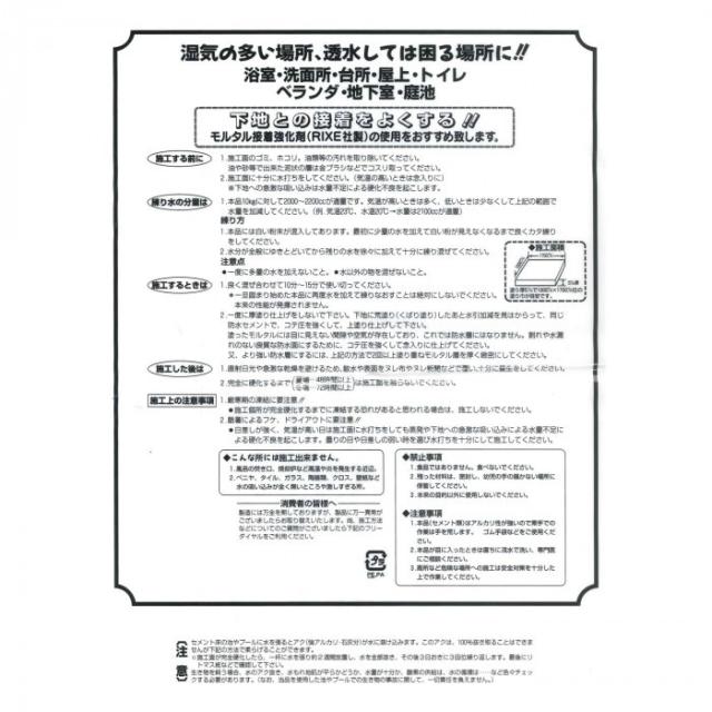 | インスタントセメントと同じ要領で水を加え、よく練り合わせて施工することで、防水性を発揮します。 標準水量:2L〜2.3L 用途・使用場所:湿気の多い場所、透水しては困る場所に、浴室、洗面所、トイレ、庭池等。 ※パッケージが変わる場合があります。 |