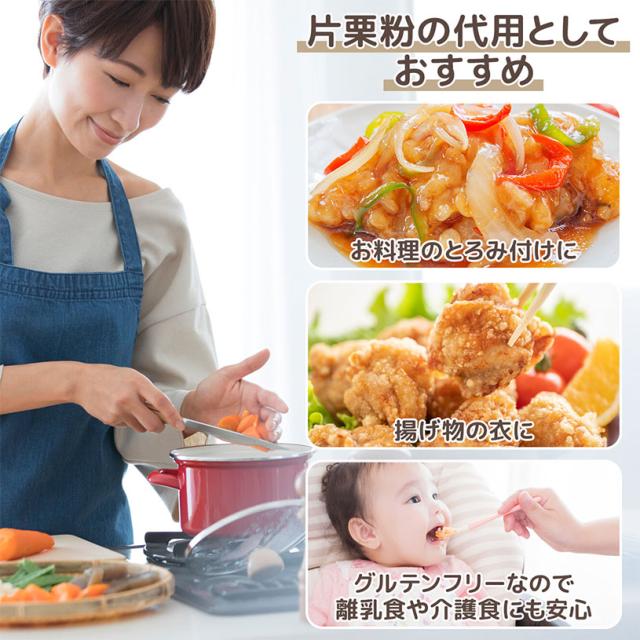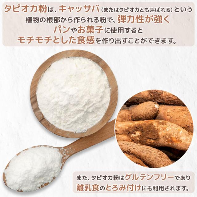 | お召し上がり方 | ポンデケージョ わらび餅 製菓材料 パン材料 など、もちもちした食感のパンやお菓子、片栗粉やコーンスターチのように、中華料理やスープのとろみ付け、つなぎ、お料理等にお使いいただけます。 |