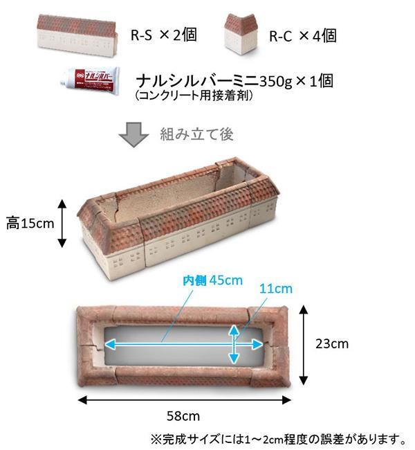 ガーデンルーフと接着剤ナルシルバーミニのセットです。このセットで手軽に長方形の花壇を組み立てられます。地中海沿岸の古びた街並みをイメージしたちょっぴり可愛い花壇ブロック。玄関や庭園の足下を、優しく、ファンタジックな趣にしてくれるガーデンアイテムです。 |