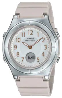 カレンダー表示機能のほか、ワールドタイム、時刻アラーム、ストップウオッチ、タイマーなど便利な機能を搭載。グレージュの樹脂バンドモデルをご用意しました。