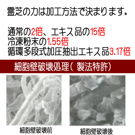 また、霊芝にとって重要な細胞壁破壊処理をしてあります。人間は牛などの草食動物と違って繊維質を消化分解できません。そのため、細胞壁破壊処理がとても重要です。細胞壁を破壊することで消化率は通常の2倍。 有効成分(全糖類:多糖体含む)も エキス品の15倍。冷凍粉末品の