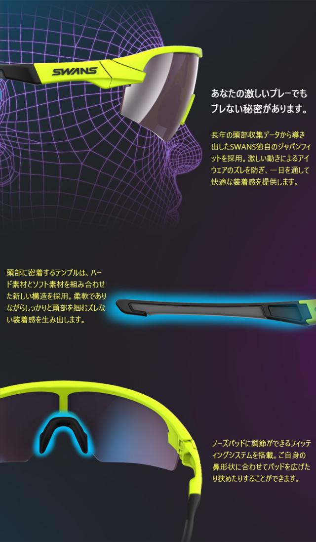 ノーズ調整機能やレンズ交換機能、フィット感の良さはそのままに風の巻き込みをさらに防ぐ新レンズ形状や滑り止め一体成型のテンプルを新たに採用。自転車やランニング、ゴルフなどあらゆるシーンでさらに快適に使用できます。