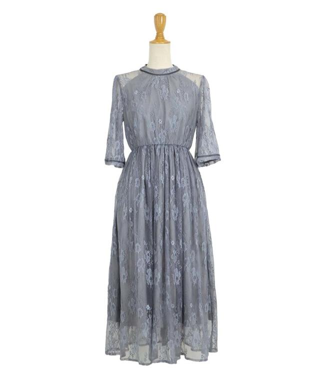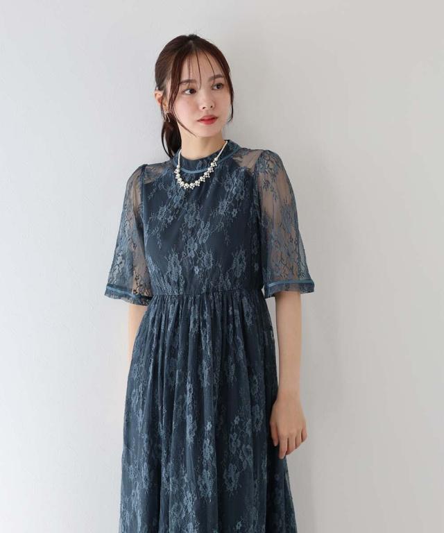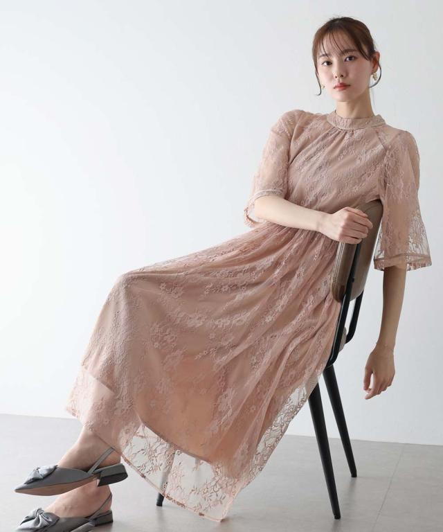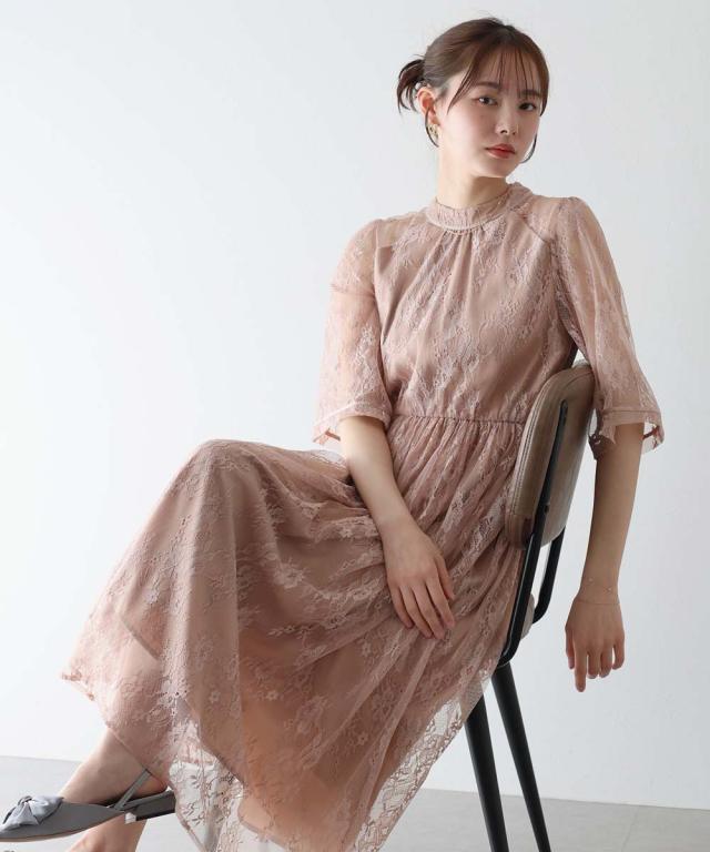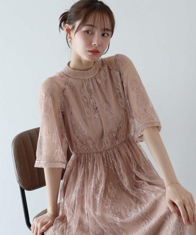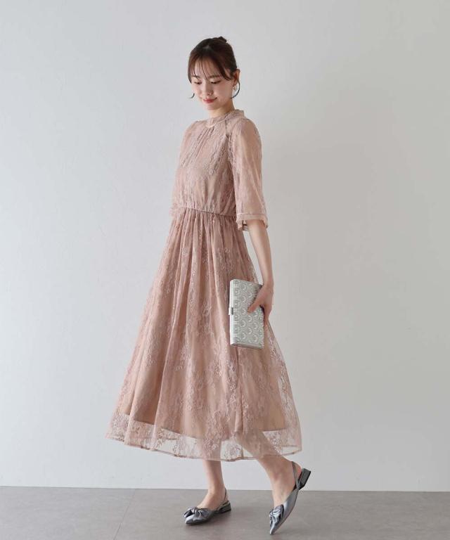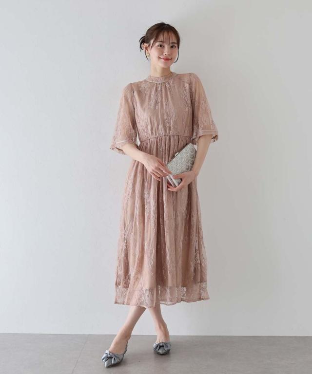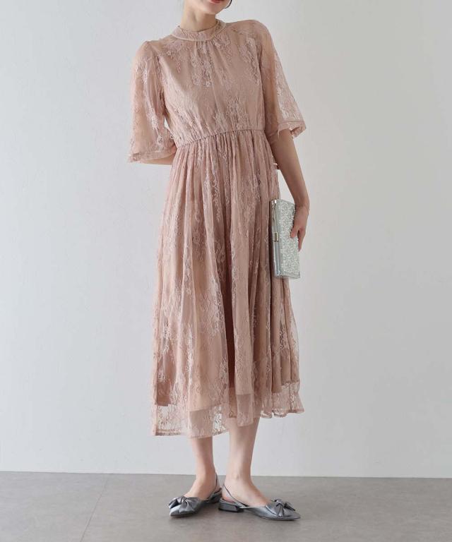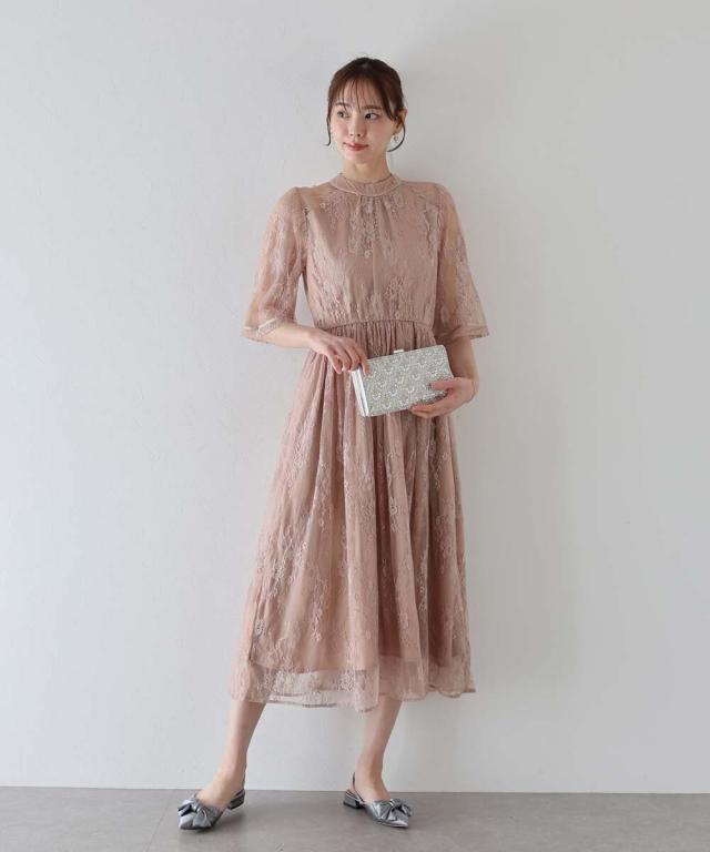 繊細な配色レースを使用し、総レースなのに甘すぎないハイネックデザインのパーティーワンピース・結婚式ワンピース