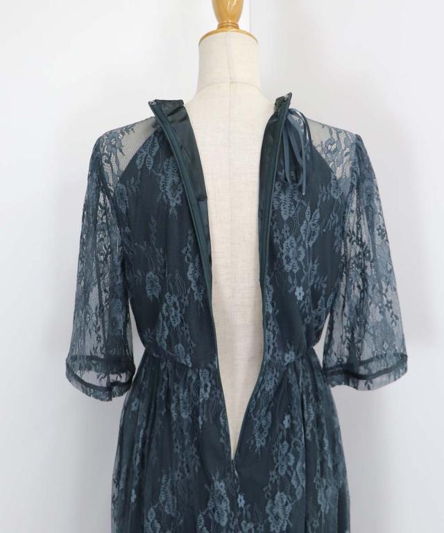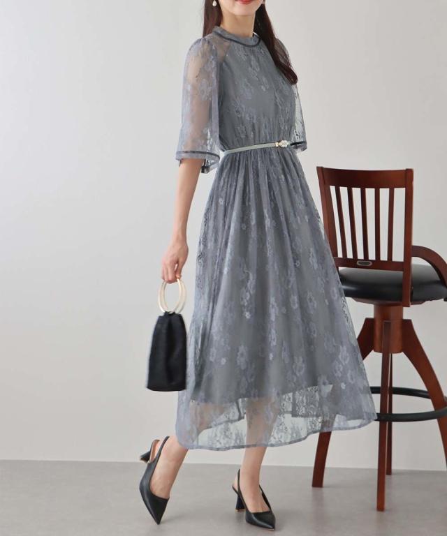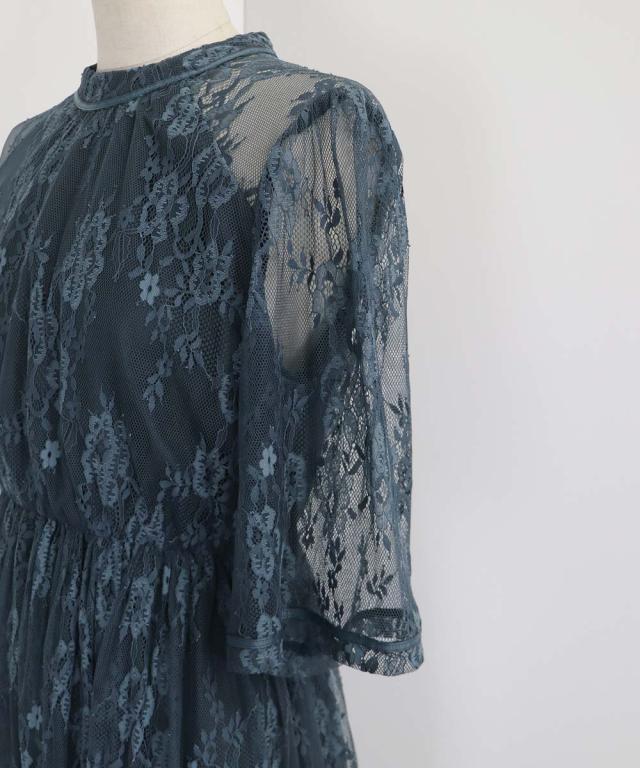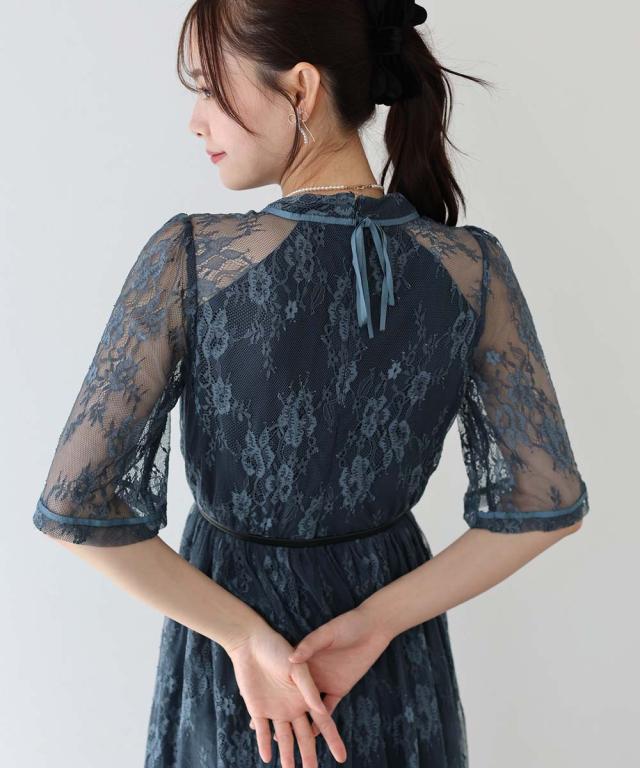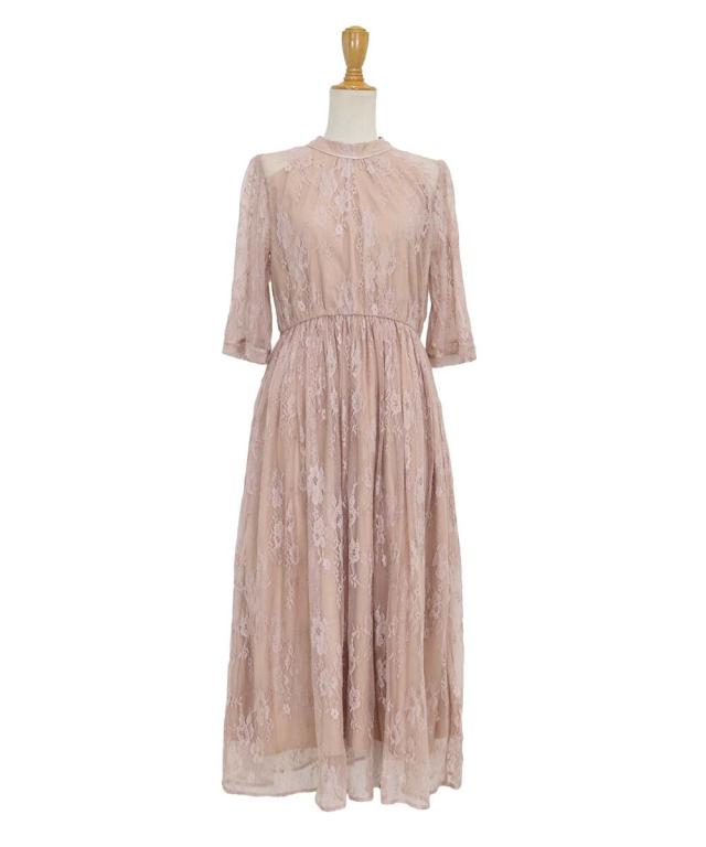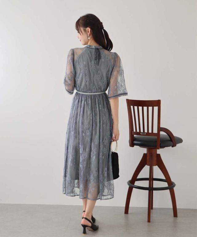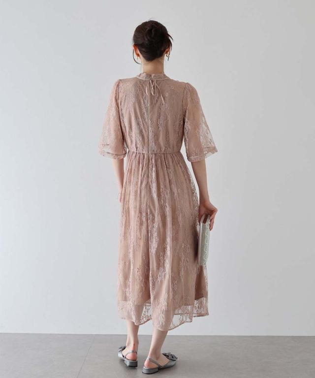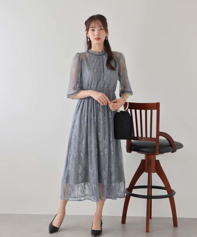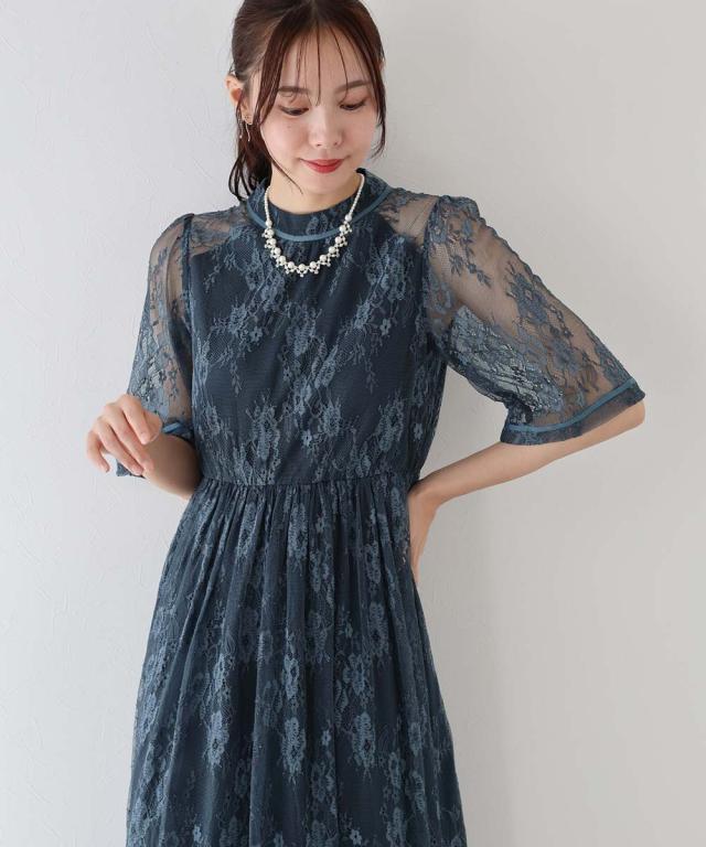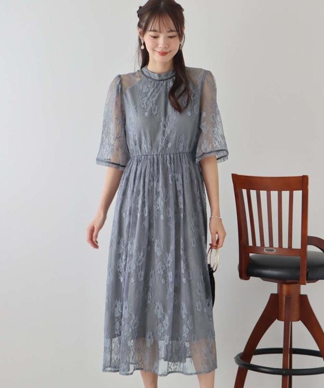 繊細な配色レースを使用し、総レースなのに甘すぎないハイネックデザインのパーティーワンピース・結婚式ワンピース