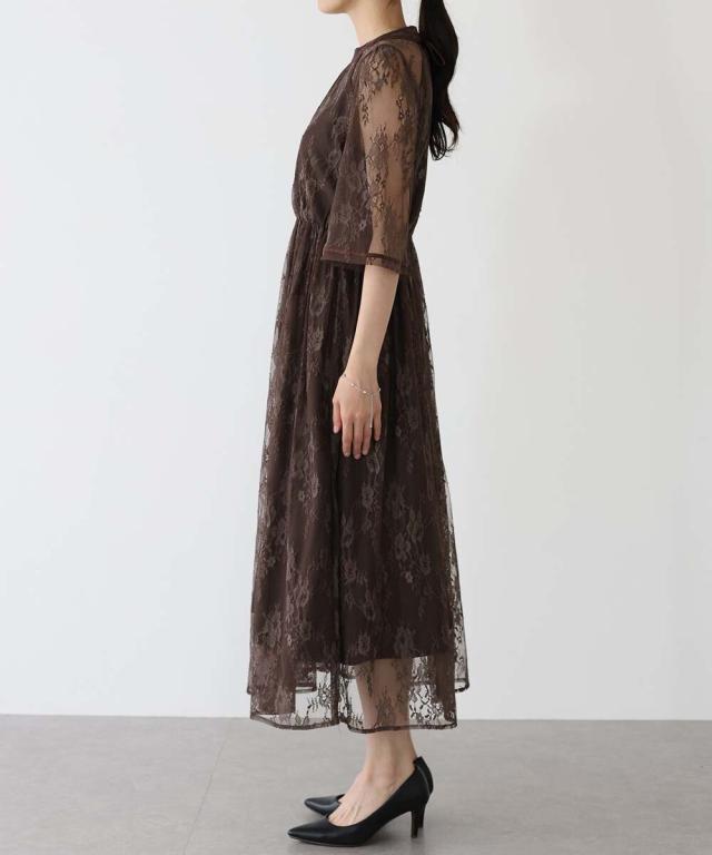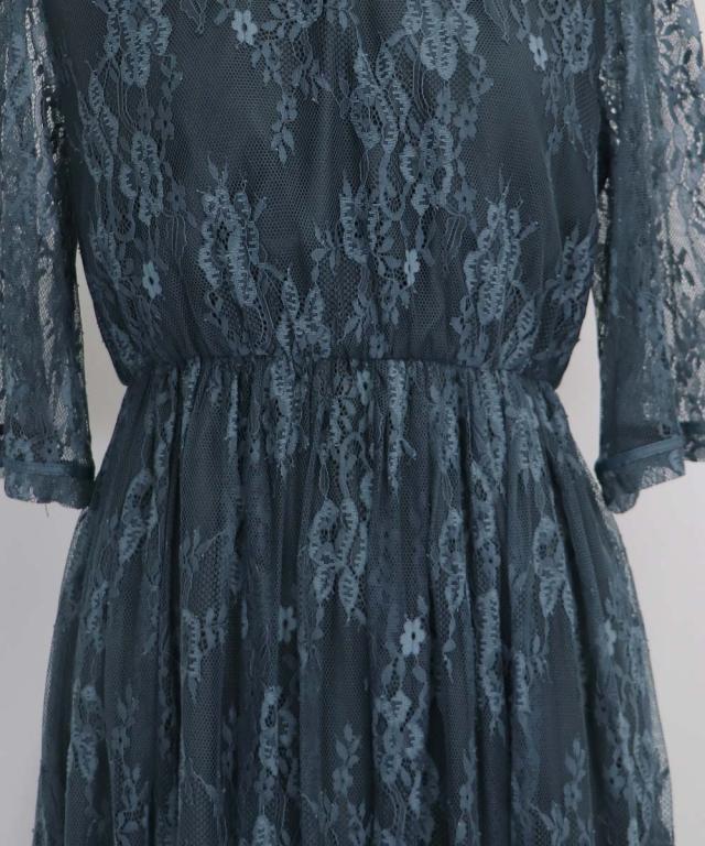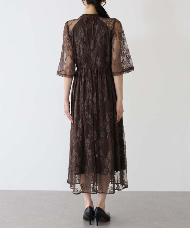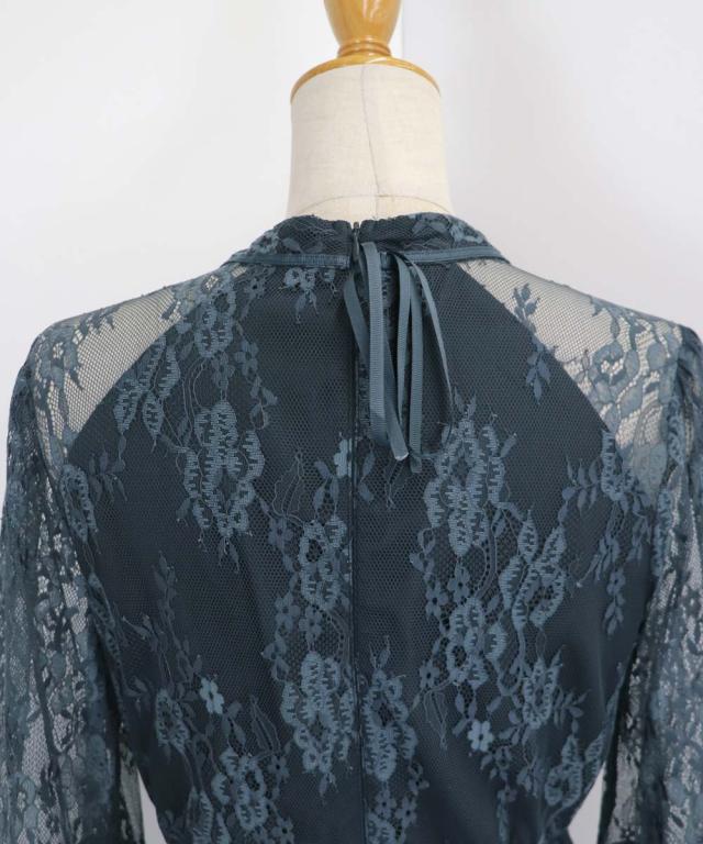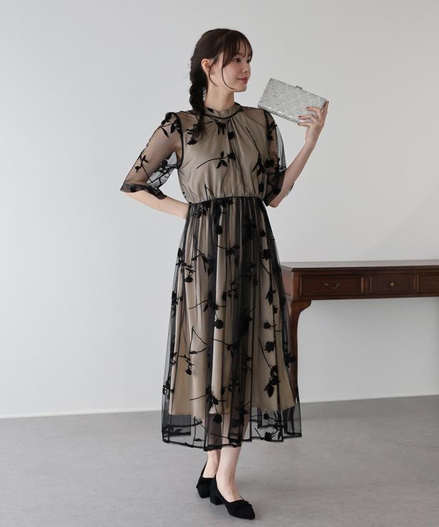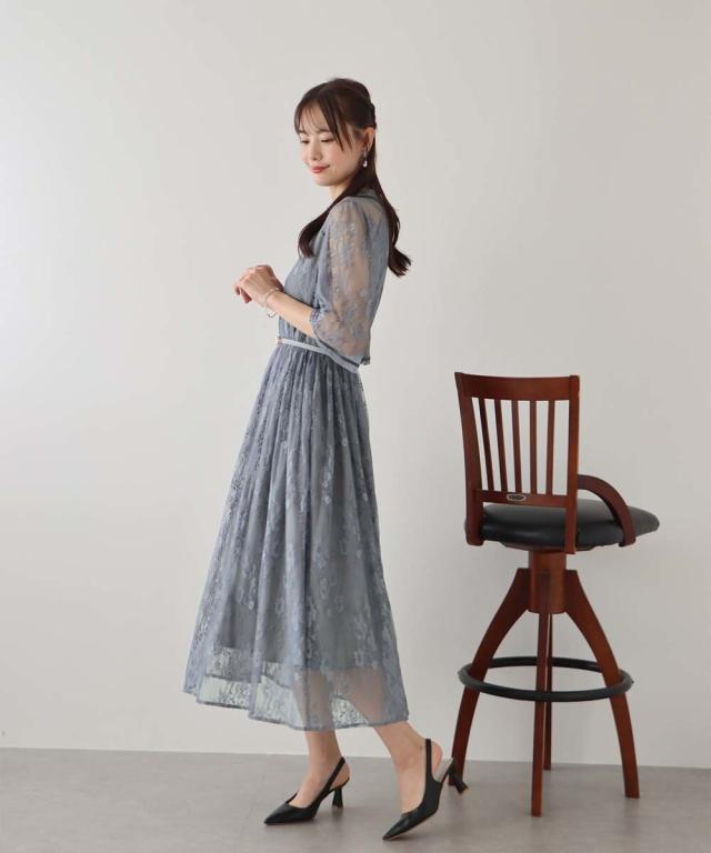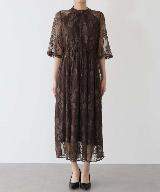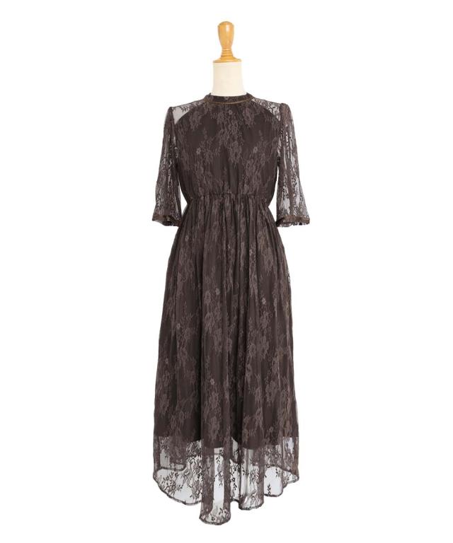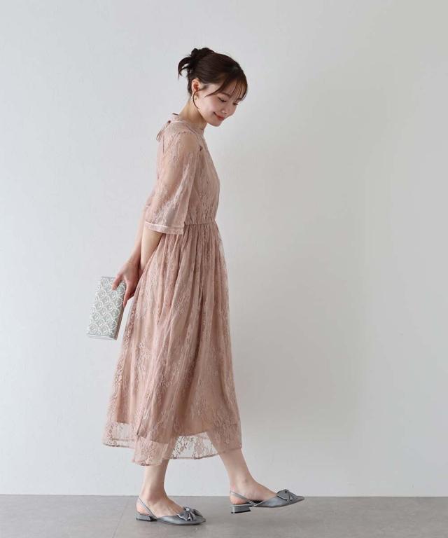繊細な配色レースを使用し、総レースなのに甘すぎないハイネックデザインのパーティーワンピース・結婚式ワンピース