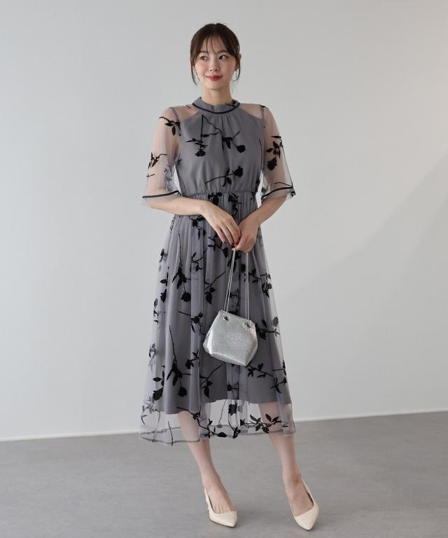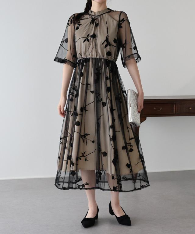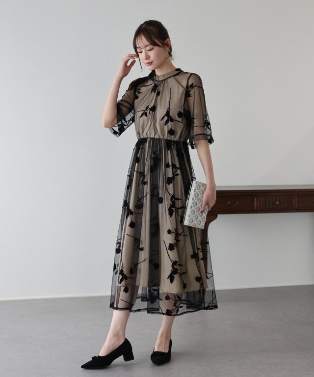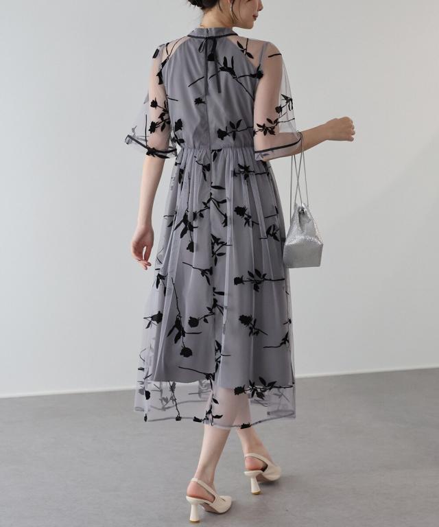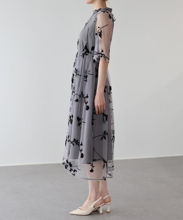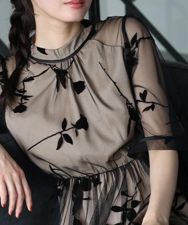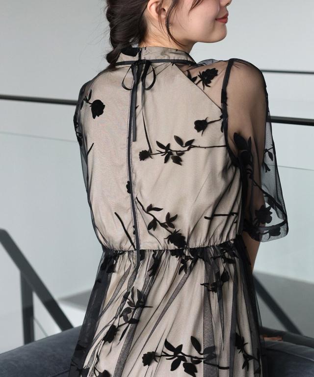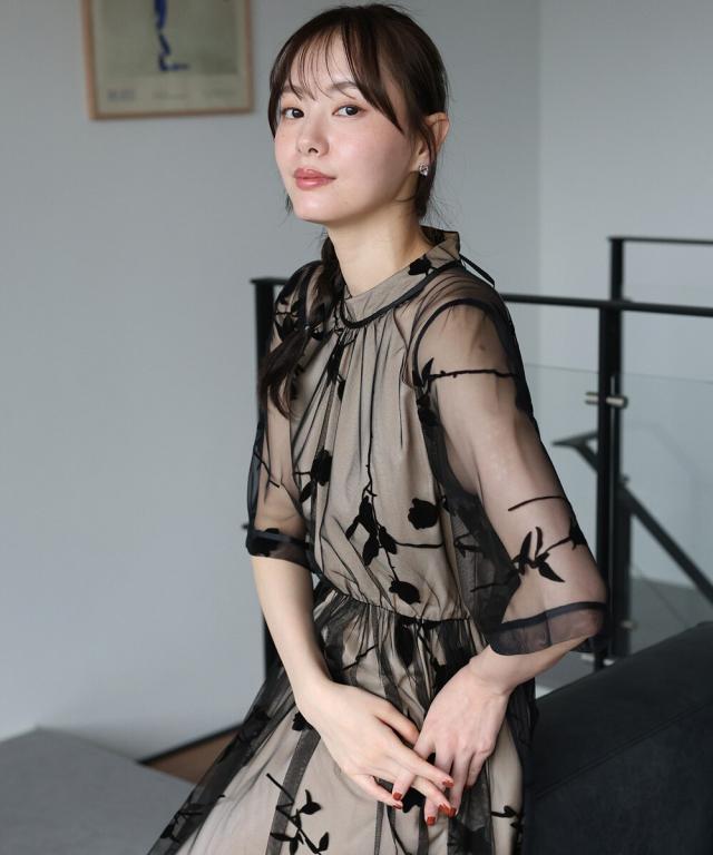 シアーな透け感は保ちつつ、あえて首元はハイネックに仕上げたことで露出を抑えて上品でクラシカルな印象。