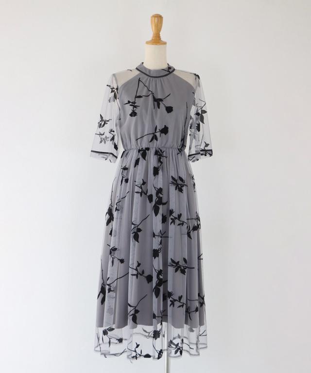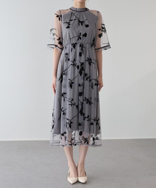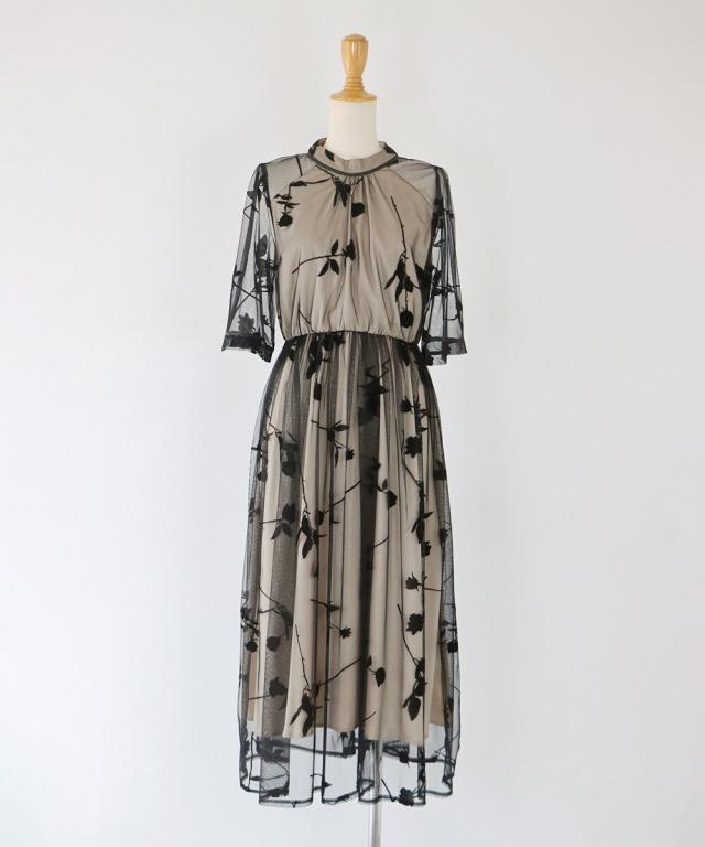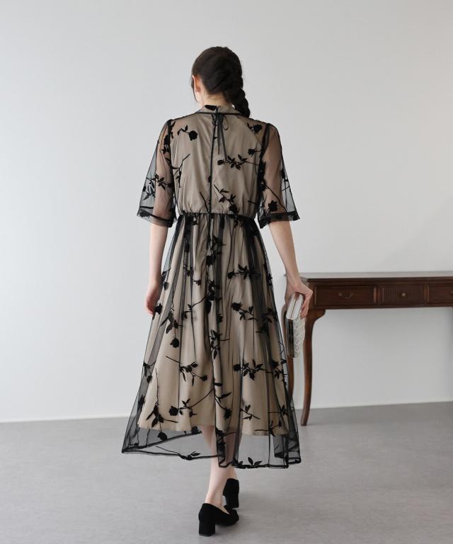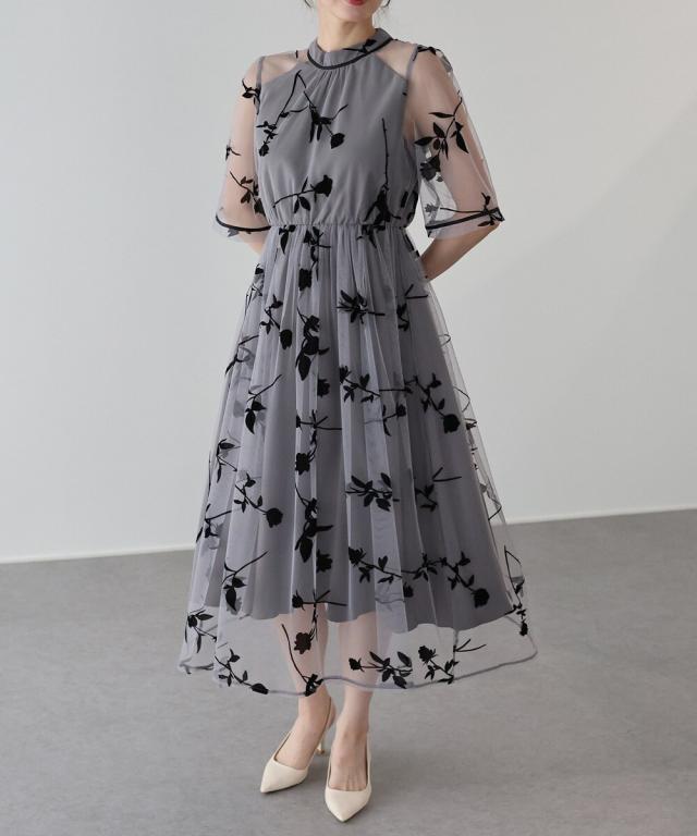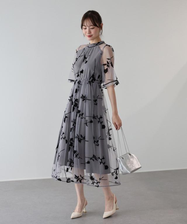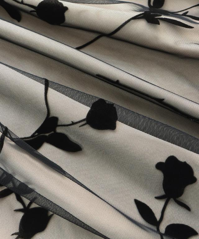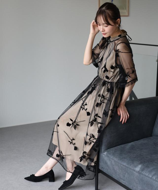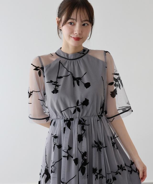 シアーな透け感は保ちつつ、あえて首元はハイネックに仕上げたことで露出を抑えて上品でクラシカルな印象。