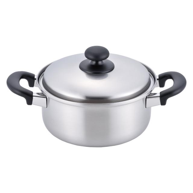 煮込み料理やたっぷりのお湯で茹でる麺料理に便利な両手鍋です。サビにくく、丈夫なステンレス製なので長くお使いいただけます。あたたかな表面加工に加え、安定感のあるデザインです。IH・ガス火両方に対応しています。