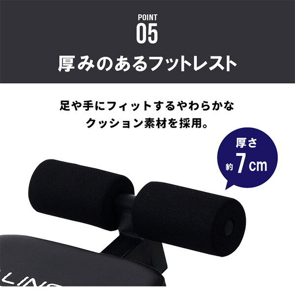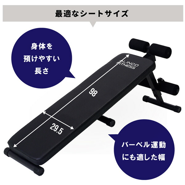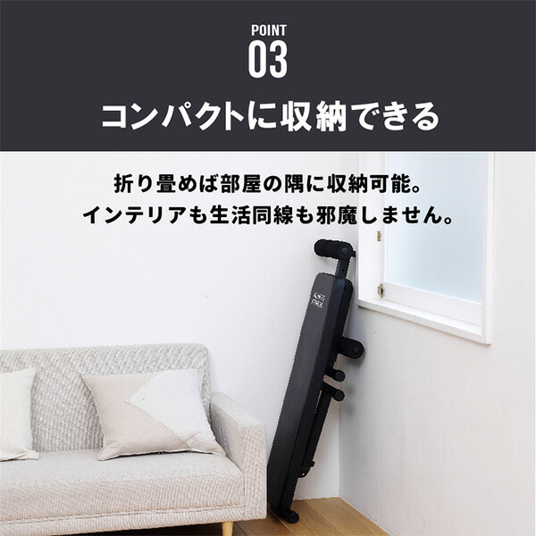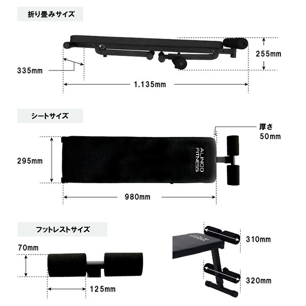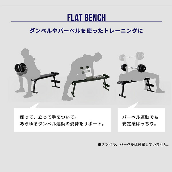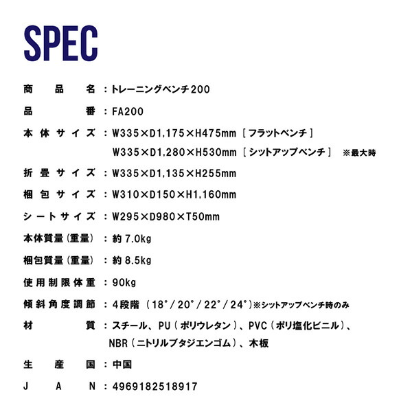 | 本体サイズ | 本体サイズ/フラットベンチ:幅33.5cm×奥行117.5cm×高さ47.5cm 重量7kg シフトアップベンチ:幅33.5cm×奥行128cm×高さ53cm 折畳サイズ:幅33.5cm×奥行113.5cm×高さ255cm |