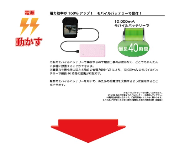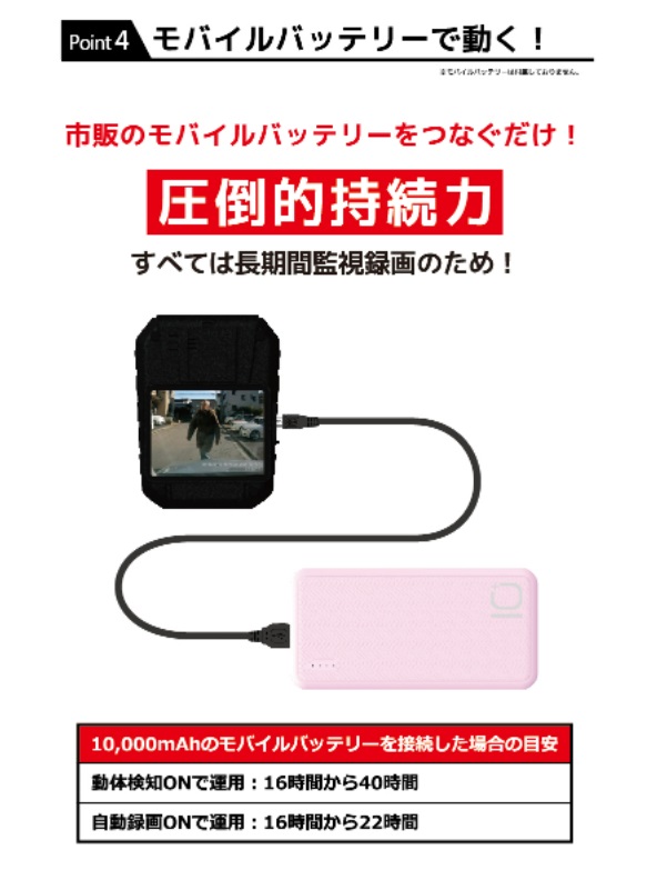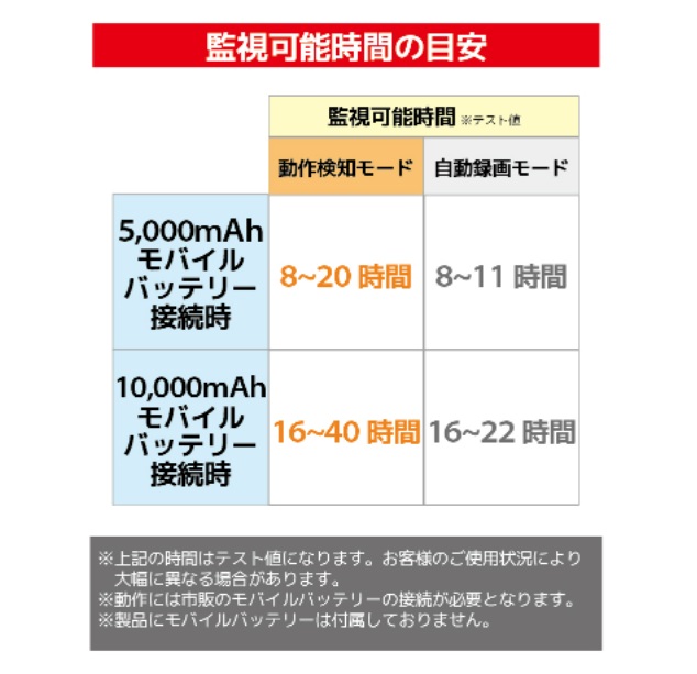 | ※ | 内蔵バッテリーは設定情報および時計情報保持用のため、動作(監視録画)には市販のモバイルバッテリー(別売)を接続する必要があります。 |