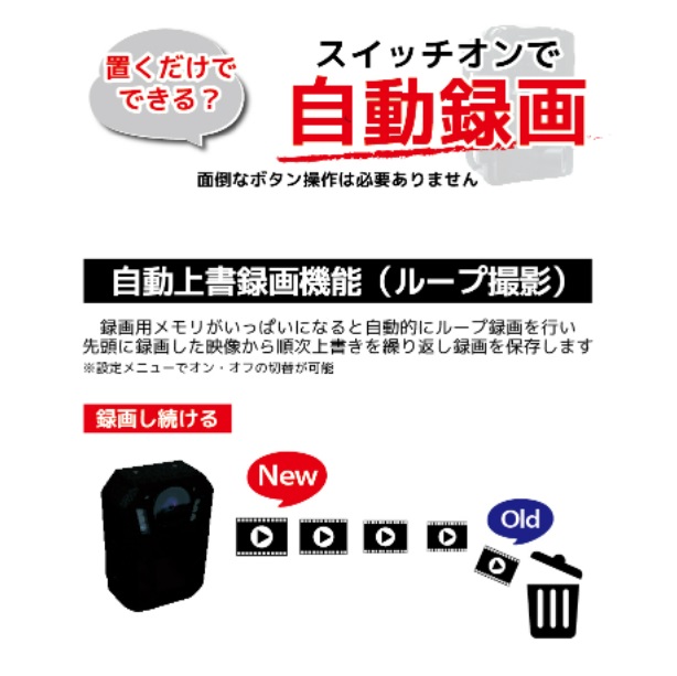| タイムスタンプ | 映像上に日付・時間を自動合成 |