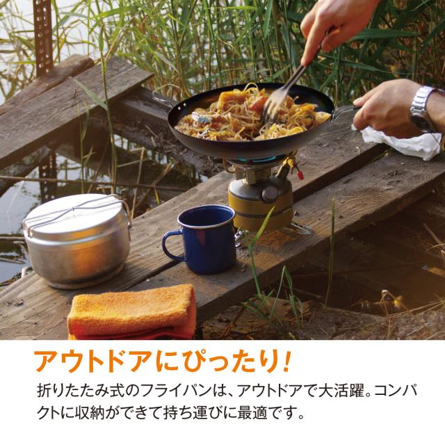 【アウトドアにぴったり!】折りたたみ式のフライパンは、アウトドアで大活躍。コンパクトに収納ができて持ち運びに便利です。