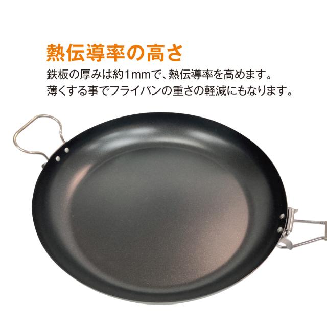【熱伝導率の高さ】鉄板の厚みは約1mmで、熱伝導率を高めます。薄くする事でフライパンの重さの軽減になります。