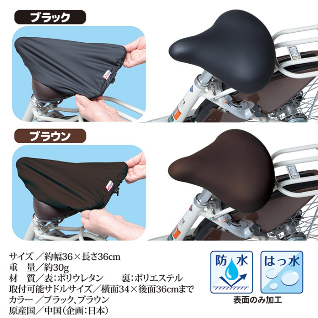 ●サイズ/約幅36×長さ36cm●重量/約30g ●材質/表:ポリウレタン 裏:ポリエステル●取付可能サドルサイズ/横面34×後面36cmまで●カラー/ブラック、ブラウン●中国製(企画:日本)