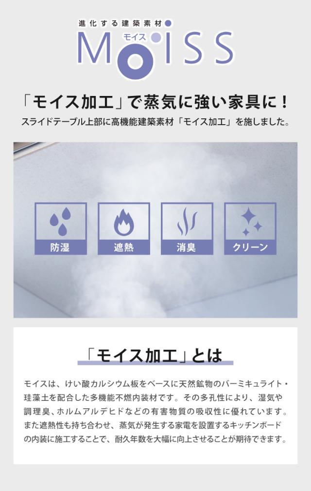 家電収納スペースの上部はモイス材を設置しております。
