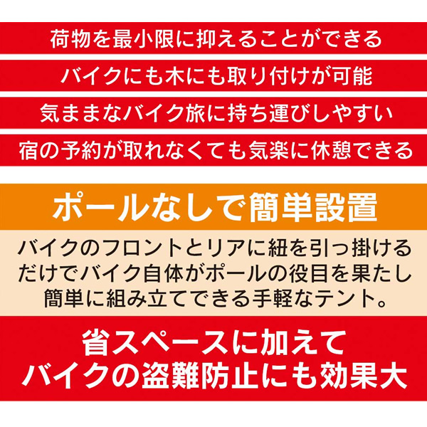 今までにありそうでなかった!ポールがいらない軽量テント オートバイはもちろん、自転車でのツーリングキャンプには、最小限の荷物で! キャンプ場のバイカー専用スペースを考慮した設計で省スペース、 コンパクト収納、簡単設営を実現しました! ■製品サイズ:約 W190×D90×H113.5cm ■収納サイズ:約 W40×18×H18cm ■製品重量:約 0.9kg ■テント素材:210D オックスフォード ■耐水圧:PU3000mm ■ペグ素材:チタンアルミ合金 ■収納袋素材:ポリエステル ■内容物:テント本体、収納袋、紐×9、ペグ×9 ※記載は商品仕様の一部です。仕様説明不足等の理由での返品はできません。特に適合等は必ずご確認ください。
