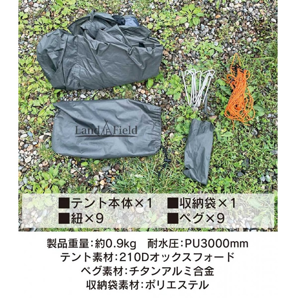 | 内容物 | テント本体、収納袋、紐×9、ペグ×9 |