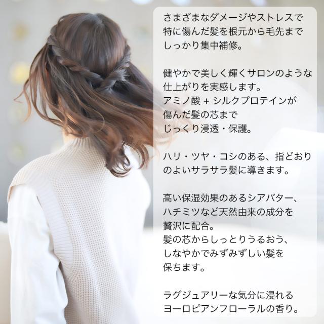 ●さまざまなダメージやストレスで特に傷んだ髪を根元から毛先までしっかり集中補修健やかで美しく輝くサロンのような仕上がりを実感します。