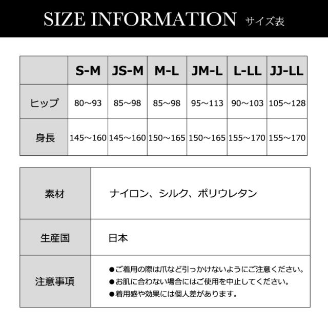 | サイズ | S-M/ヒップ約80~93cm、身長145~160cm M-L/ヒップ約85~98cm、身長150~165cm JM-L/ヒップ約95~113cm、身長150~165cm L-LL/ヒップ約90~103cm、身長155~170cm JJ-LL/ヒップ約105~128cm、身長155~170cm |