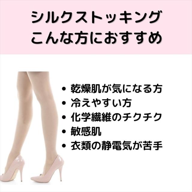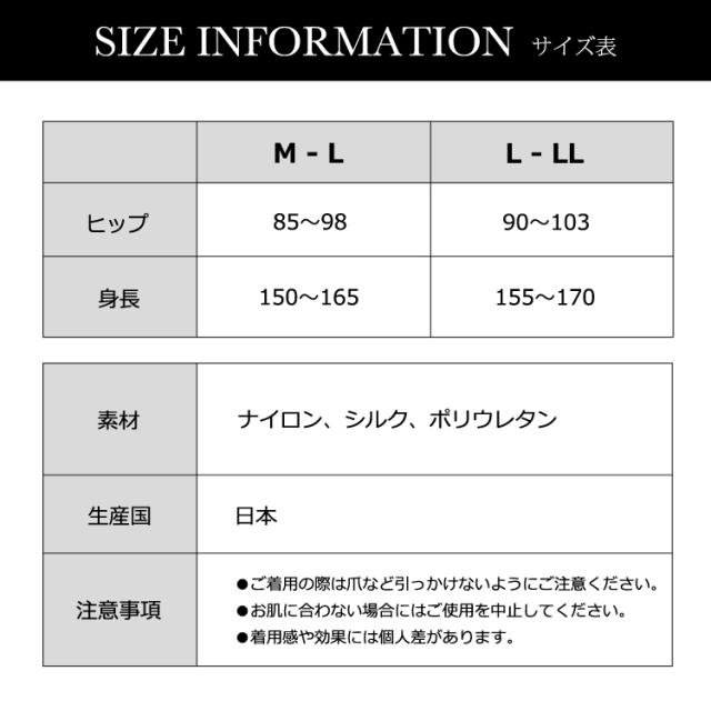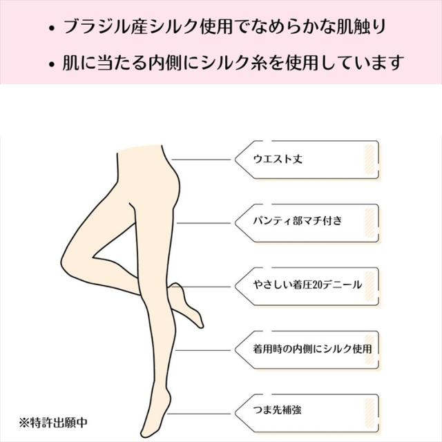 レッグ部の肌に当たる側の糸にシルクを使用しています。やさしい肌触りと、滑らかな質感です。特許申請中特徴なめらかな肌ざわりで足をきれいに見せる。適度な着圧感です。