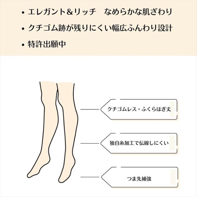 | 特徴 | なめらかな肌ざわりで足をきれいに見せる。適度な着圧感です。 エレガント 光沢 通勤 通学 お仕事 ウエディング |