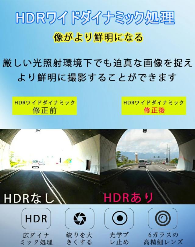 前後170度の広範囲を常時録画。WDR(白飛び・夜間対策)ワイドダイナミックレンジ機能搭載。