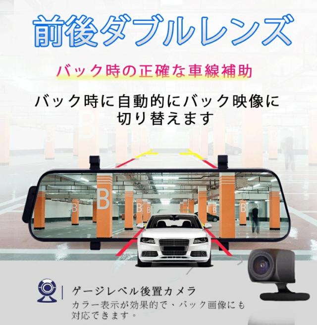 ドライブレコーダー 前後カメラ ミラー型 1296P高画質 1200万画素 10インチ タッチパネル ドラレコ 170度広角視野 HDR 赤外線暗視 駐車監視 ループ録画 動体検知 衝撃録画 Gセンサー 録音機能 1年保証 防犯 防犯グッズ 送料無料