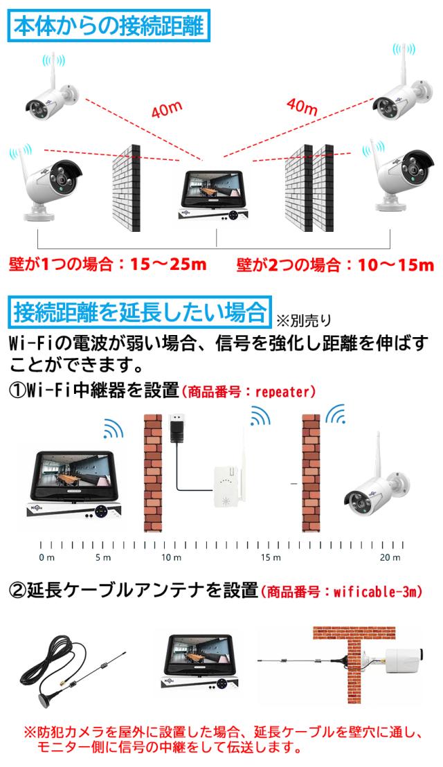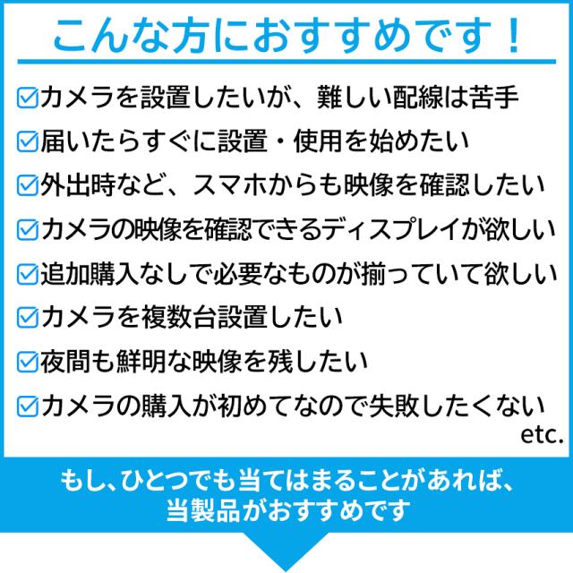 ・ワイヤレス接続の場合でも、電源ケーブルなしでシステムを使用することはできません。カメラとNVRへの電源供給は必要となります。