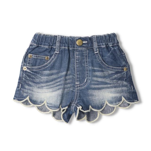 夏にオススメ!薄手のストレッチデニムとストレッチヒッコリーの2色展開のショートパンツ。裾が丸いカットのスカラップデザインで、かっこよさの中に可愛さがあるアイテム。【アイテム】ナチュラル シンプル ベーシック フェミニン ガーリー 無地 カジュアル お洒落 オシャレ かわいい 大人可愛い 普段着 デイリーウェア お出かけ着 お外着 外遊び着 膝上丈 ハーフパンツ 半パン 短パン 半ズボン ボトムス 子ども こども 女児 女の子 ガールズ キッズ ベビーサイズ トドラーサイズ 幼稚園 保育園 小学校 通園 通学 小学生 2022年夏物新作 丸高衣料 ショーパン アメカジ アメリカン カジュアル ジュニアサイズ スクールサイズ