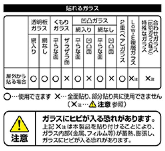 | 注意事項 | 使用できるガラス 透明板ガラス、くもりガラスの平らな面、凹凸ガラスの平らな面、2重(ペア) ガラス 使用できないガラス 合わせガラス、複層ガラス、凹凸・ザラザラしたガラス面 ※温度差変化でガラスが割れる場合があります。(熱割れ現象) ※水が直接かかる浴室内のガラス戸などにはご使用できません。 |