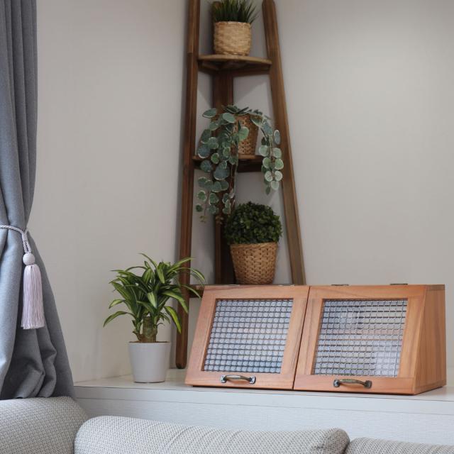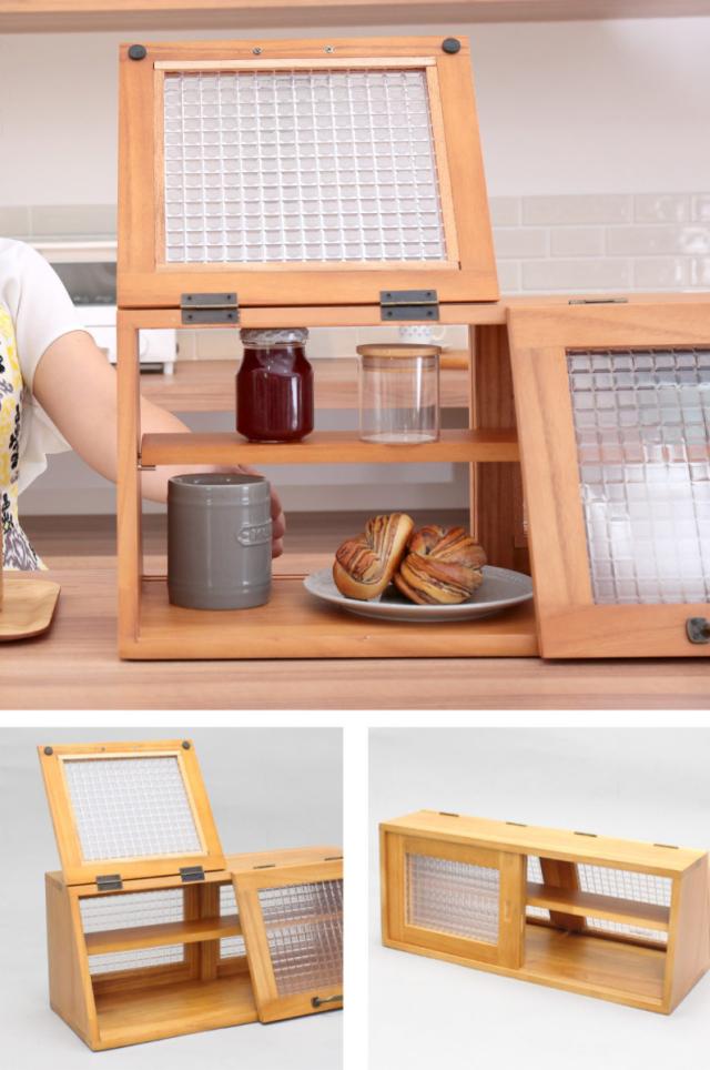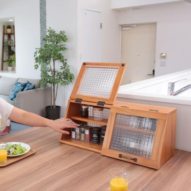 出しておくとごちゃごちゃと見えてしまう、キッチン周りの細々した物をすっきり収納できる、天然木製ショーケースです。必要な時にすぐ手に取りたい調味料やカトラリーも、サッと取り出せて便利です。ティーセットの収納やブレッドケースとしても使いやすく、置くだけでカフェのような空間を演出できます。