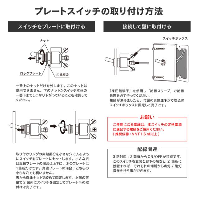 | 注意事項 | ●スイッチの取付は電気工事士の資格が必要です。取付、取替は電気工事店にご依頼をお願い致します。 ●絶対にしろうと工事はしないでください。 ●裸圧着端子は使用する電線と適合させてください。不適合の場合は、圧着不十分による緩みやカケにより思わぬ事故や火災の原因になります。 ●部品の追加、変更などの器具の改造は絶対にしないでください。 ●器具のすきまに金属類や紙類を絶対に差し込まないでください。感電や火災の危険性があります。 ●本スイッチの定格電流に適合する電線をご使用ください。(推奨電線:VVF1.6mm2以上) 【真鍮商品について】 真鍮素材は素手で触ると、そこから酸化が始まり部分的に色ムラが発生します。また真鍮本来の素材感を活かすため、傷やシミなどがある場合がございますが、真鍮素材の持ち味としてお楽しみください。裏面は研磨されておりませんので、傷やシミ、汚れが全面にありますが不良ではありません。(傷やシミ、汚れによる交換・返品対応は出来かねます。予めご了承ください。) |