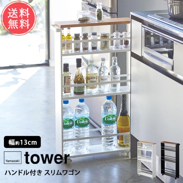 送料無料 山崎実業 tower タワー ハンドル付きスリムワゴン【キャスター付 コンパクト スリム 収納 隙間 ワゴン キッチンワゴン ラック 収納ラック 隙間ラック 隙間収納 洗面所 おしゃれ シンプル 白 黒 ホワイト ブラック 便利 北欧】