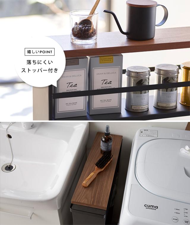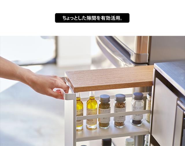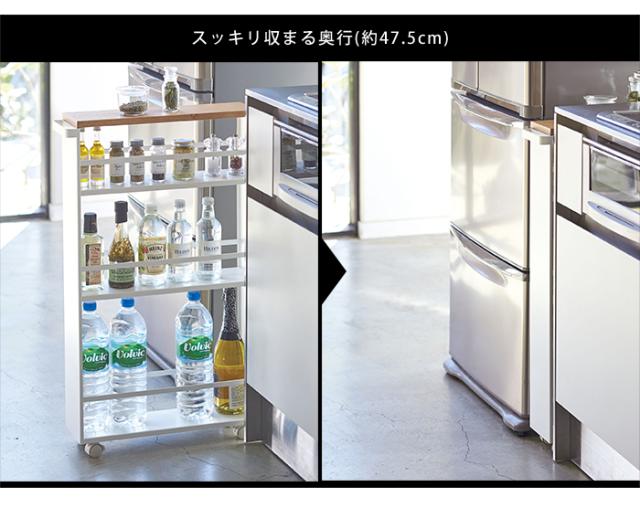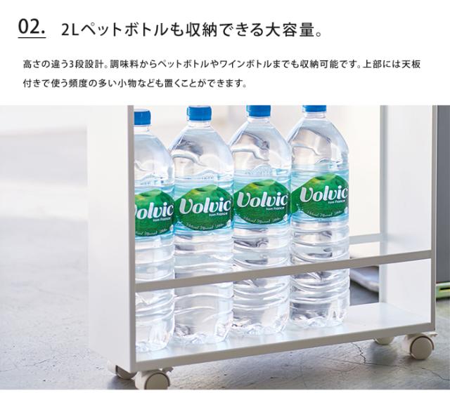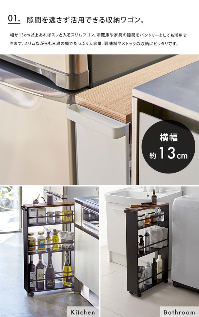 幅が13cm以上あればスッと入るスリムワゴン。スリムながらも三段の棚で大容量。調味料からペットボトルも収納可能です。引き出しやすいハンドルとキャスターもついています。