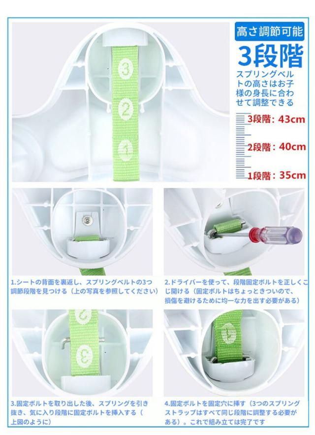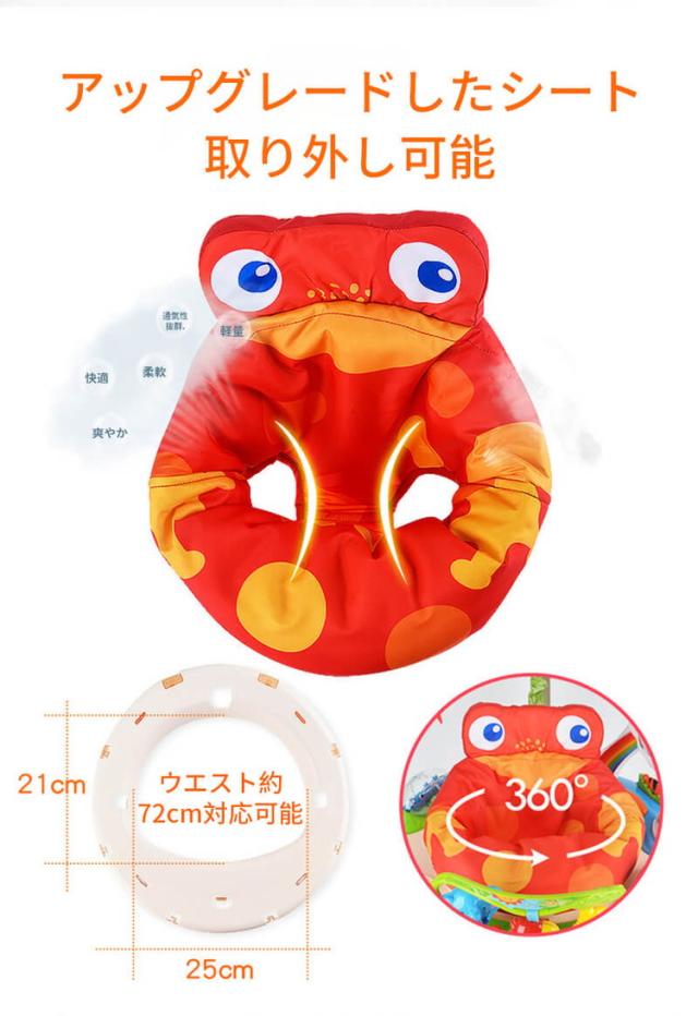 シートには、赤ちゃんのアクションにいろいろな反応を返すおもちゃ付き。シートが360度回転するので、どこに向いて座っても、好きなおもちゃで思いきり遊べます。 成長に合わせ3段階にシートの高さを調整できます。持ち運び用にコンパクトにたためます!座席のシート部分は取り外して洗濯できます。
