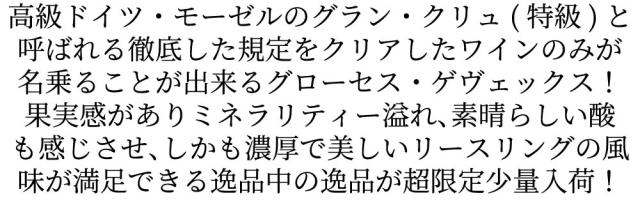 ワインアドヴォケイト誌で驚異の96点高評価!高級ドイツ・モーゼルのグラン・クリュ(特級)と呼ばれる徹底した規定をクリアしたワインのみが名乗ることが出来るグローセス・ゲヴェックス!果実感がありミネラリティー溢れ、素晴らしい酸も感じさせ、しかも濃厚で美しいリースリングの風味が満足できる逸品中の逸品が超限定少量入荷!